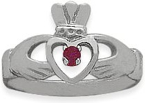 This high polish claddaugh ring is a perfect blend of style and tradition. This 10 karat gold ring features a 2.5mm synthetic ruby stone in the center. The ring measures 9mm wide on top and 2mm on the bottom. Usually ships within 2-3 business days.