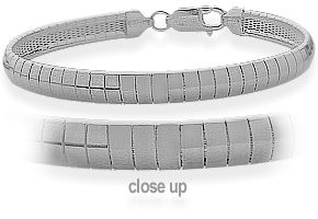This omega styled sterling silver bracelet is a timeless classic. The bracelet measures 7 ½ inches in length and 6mm in width. The high polish finish gives this bracelet a sense of style and charisma. The closure is made possible via a lobster catch terminal and eyelet. Ships NEXT business day.
