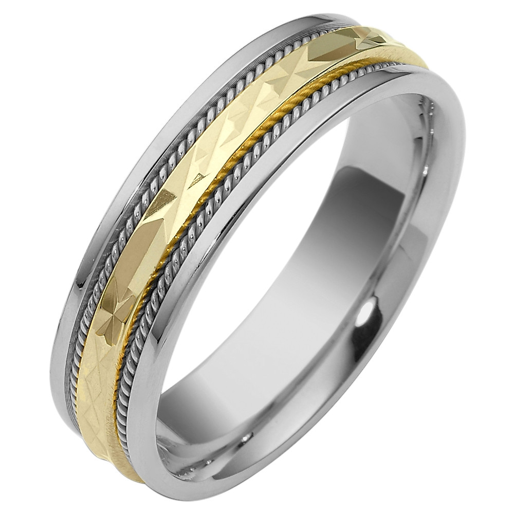 Enjoy the masterful smooth design of this beautifully detailed two-tone gold designer band. Measuring 6mm wide, this comfort fit band is the perfect blend of style and sophistication. The ultimate in craftmanship and quality. NOTE: This wedding band is custom made to order.This ring is available in a variation of metals, colors & widths. Available metals include all gold types, platinum, palladium, titanium and steel. Please contact customer service with any questions, for a free ring sizer or any special order requests.