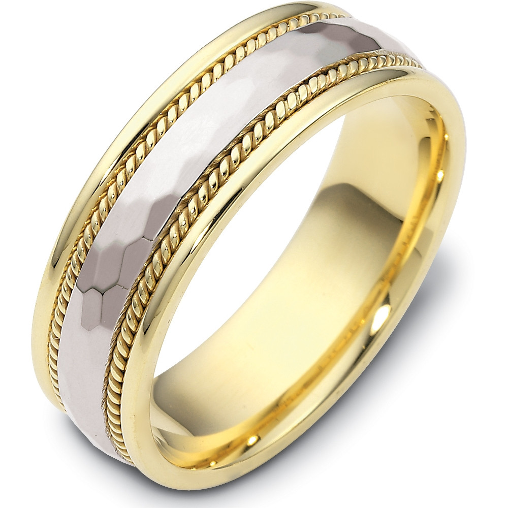 Enjoy the masterful smooth design of this beautifully detailed two-tone gold designer band. Measuring 7mm wide, this comfort fit band is the perfect blend of style and sophistication. The ultimate in craftmanship and quality. NOTE: This wedding band is custom made to order. This ring is available in a variation of metals, colors & widths. Available metals include all gold types, platinum, palladium, titanium and steel. Please contact customer service with any questions, for a free ring sizer or any special order requests.