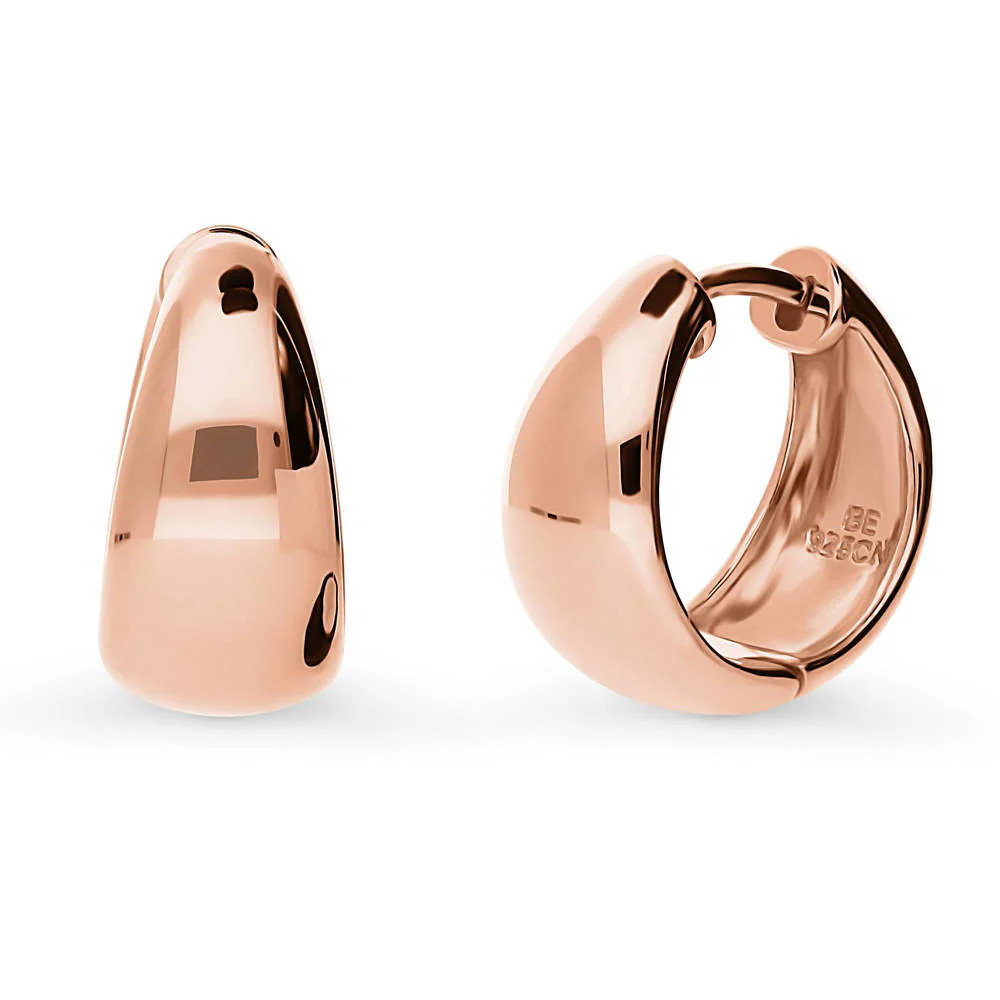These rose gold flashed genuine sterling silver huggie hoop earrings are 7.4mm (0.3 inches) wide, tapering down to 3.8mm (0.15 inches) wide, 14.8mm (0.6 inches) high and are secured with a hinged post.
