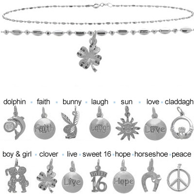 This bead style anklet and all charms are crafted of genuine sterling silver. The anklet measures 0.05 inches (1.3mm) in width and is available in your choice of 9 inches or 10 inches in length. Available charms: Boy & Girl, Bunny, Claddagh, Clover, Dolphin, Faith, Horseshoe, Laugh, Live, Love, Peace, Sun and Sweet 16.