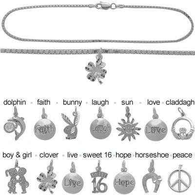 This box style anklet and all charms are crafted of genuine sterling silver. The anklet measures 0.05 inches (1.4mm) in width and is available in your choice of 9 inches or 10 inches in length. Available charms: Boy & Girl, Bunny, Claddagh, Clover, Dolphin, Faith, Horseshoe, Laugh, Live, Love, Peace, Sun and Sweet 16.