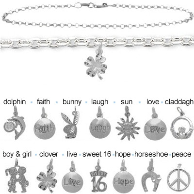 This flat cable style anklet and all charms are crafted of genuine sterling silver. The anklet measures 0.06 inches (1.5mm) in width and is available in your choice of 9 inches or 10 inches in length. Available charms: Boy & Girl, Bunny, Claddagh, Clover, Dolphin, Faith, Horseshoe, Laugh, Live, Love, Peace, Sun and Sweet 16.