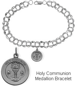 This elegant sterling silver Holy Communion religious bracelet is a masterpiece. The bracelet measures 8 inches in length and 0.33 inches or 8.2mm in width. The medallion measures 0.57 inches or 14.4mm in diameter. The closure is made possible with a lobster catch terminal.