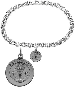 This elegant sterling silver Holy Communion religious bracelet is a masterpiece. The bracelet measures 7.5 inches in length and 0.22 inches or 5.6mm in width. The medallion measures 0.57 inches or 14.4mm in diameter. The closure is made possible with a lobster catch terminal.