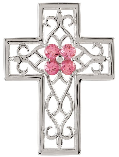This cross pendant is crafted of genuine sterling silver. Accompanied by four pink tourmaline stones that measure 3mm in diameter. This pendant is available as single pendant or a pendant witha 16 inch, 18 inch, 20 inch, 22 inch or 24 inch chain.