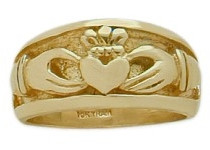 This high polish claddagh knot ring is a perfect blend of style and tradition. This 10 karat yellow gold ring measures 0.4 inches or 9mm wide on top and 0.2 inches or 4mm on the bottom.