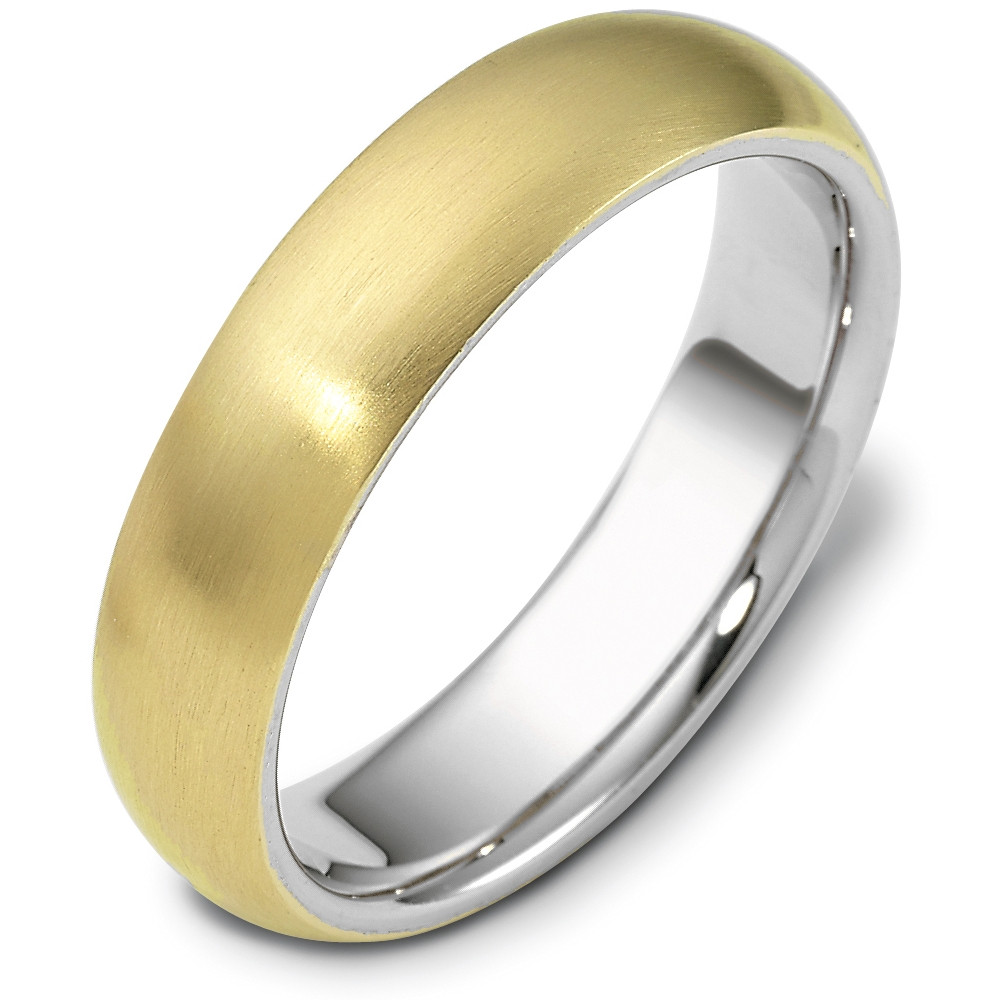 Enjoy the masterful design of this traditional wedding band with a twist on detail. Measuring 6mm wide, this comfort fit band displays yellow gold on the outside and white gold both on the sides and inside. The perfect blend of tradition and style is The ultimate in craftmanship and quality. NOTE: This wedding band is custom made to order. Therefore please allow 8-10 business days to manufacture before shipment. This ring is also available in a variation of metals, colors & widths. Available metals include all gold types, platinum, palladium, titanium and steel. Please contact customer service with any questions, for a free ring sizer or any special order requests.