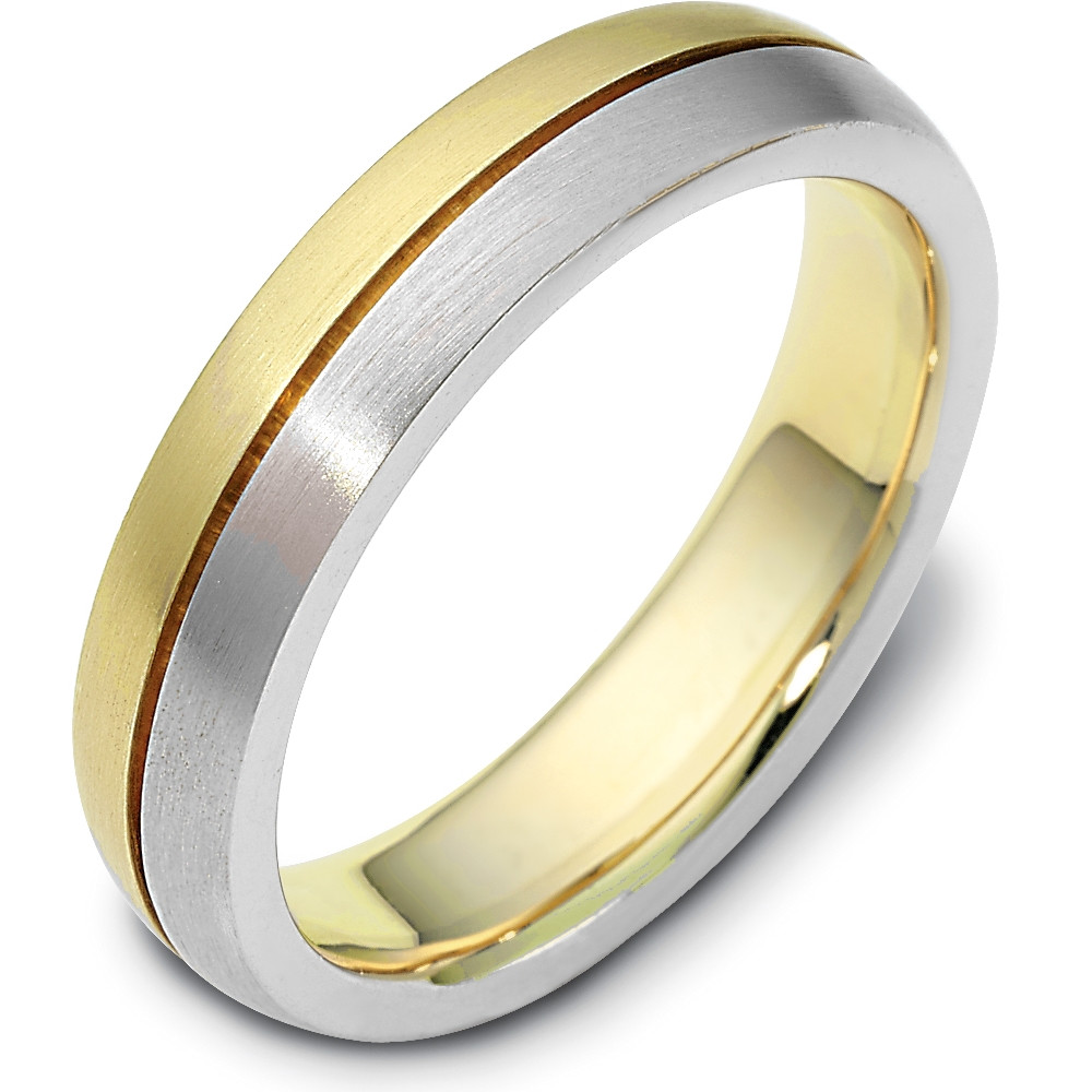 Enjoy the masterful smooth design of this beautifully detailed two-tone gold designer band. Measuring 5mm wide, this comfort fit band is the perfect blend of style and sophistication. The ultimate in craftmanship and quality. NOTE: This wedding band is custom made to order. This ring is also available in a variation of metals, colors & widths. Available metals include all gold types, platinum, palladium, titanium and steel. Please contact customer service with any questions, for a free ring sizer or any special order requests.