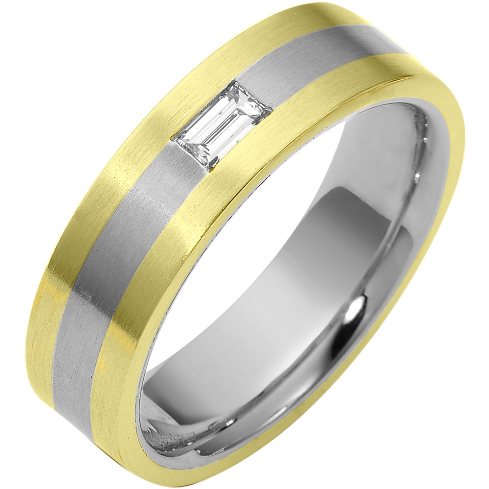 This designer two-tone band is definitely a masterpiece. 1 sparkling SI clarity, GH color round brilliant diamond totaling 0.200 carats adorn the band. Measuring 6.5mm wide, this comfort fit band will definitely be the talk of the town. The ultimate in craftmanship and quality. NOTE: This wedding band is custom made to order. This ring is also available in a variation of metals, colors & widths. Available metals include all gold types, platinum, palladium, titanium and steel. Please contact customer service with any questions, for a free ring sizer or any special order requests.