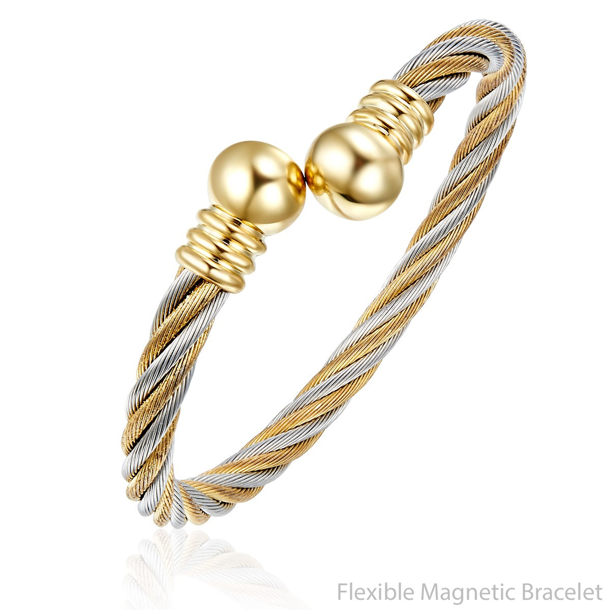 This two-tone yellow & silver coloured flexible steel magnetic bangle style bracelet measures 0.19 inches or 5mm in width. These magnetic fields help to improve blood circulation and stimulate the body to heal itself. Wearing a magnetic bracelet can help as a remedy for migraines, neck and back aches, arthritis and muscle cramps by restoring the bodys energy balance. Magnetic products are considered to be unproven remedises. IMPORTANT MAGNETIC BRACELETS ARE NOT RECOMMENDED TO BE USED BY PEOPLE FITTED WITH HEART PACEMAKERS AND BY PREGNANT WOMEN. CONSULT YOUR DOCTOR IF YOU HAVE ANY QUESTIONS.