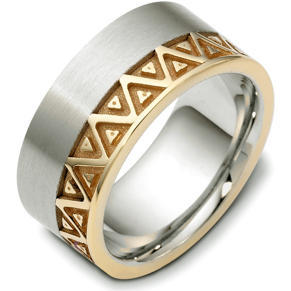 Enjoy the exquisite design of this beautifully detailed high polish and satin finish band. Measuring 10mm wide, this comfort fit band is definitely an eye catcher. The ultimate in craftmanship and quality. NOTE: This designer wedding band is custom made to order. Therefore please allow up to 2 weeks to manufacture before shipment. For rush shipments please contact customer service. This ring is also available in a variation of metals, colors & widths. Available metals include all gold types, platinum, palladium, titanium and steel. Please contact customer service with any questions, for a free ring sizer or any special order requests.