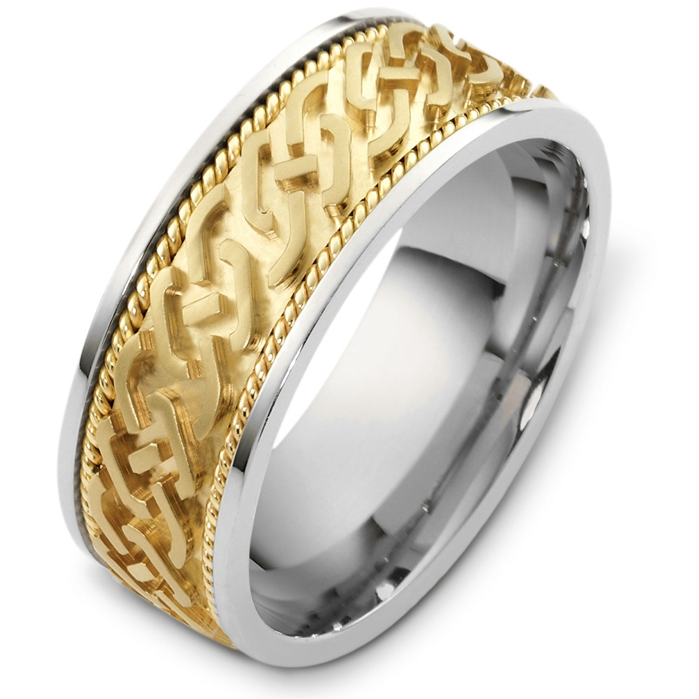 Enjoy the exquisite design of this beautifully detailed two-tone band. Measuring 8mm wide, this comfort fit band is definitely an eye catcher. The ultimate in craftmanship and quality. NOTE: This designer wedding band is custom made to order. Therefore please allow up to 2 weeks to manufacture before shipment. For rush shipments please contact customer service. This ring is also available in a variation of metals, colors & widths. Available metals include all gold types, platinum, palladium, titanium and steel. Please contact customer service with any questions, for a free ring sizer or any special order requests.