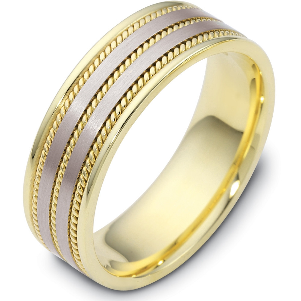 Enjoy the masterful smooth design of this beautifully detailed two-tone gold designer band. Measuring 7mm wide, this comfort fit band is the perfect blend of style and sophistication. The ultimate in craftmanship and quality. NOTE: This wedding band is custom made to order. This ring is available in a variation of metals, colors & widths. Available metals include all gold types, platinum, palladium, titanium and steel. Please contact customer service with any questions, for a free ring sizer or any special order requests.