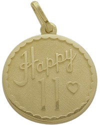 This happy #11 age expression pendant is crafted of 10 karat yellow gold. The pendant measures 19mm or 0.75 inches in diameter. Choose between a single pendant or a pendant with a 16 inch, 18 inch, or 20 inch chain.