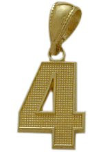 This number pendant is crafted in yellow gold. Measuring 0.7 inches or 18mm in height and 0.4 inches or 11mm in width, this 4 pendant is available as a single pendant or with a 16 inch, 18 inch or 20 inch necklace. This pendant is also available in your choice of 10 karat or 14 karat yellow gold.