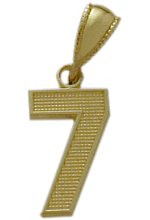 This number pendant is crafted in yellow gold. Measuring 0.7 inches or 18mm in height and 0.4 inches or 9mm in width, this 7 pendant is available as a single pendant or with a 16 inch, 18 inch or 20 inch necklace. This pendant is also available in your choice of 10 karat or 14 karat yellow gold.
